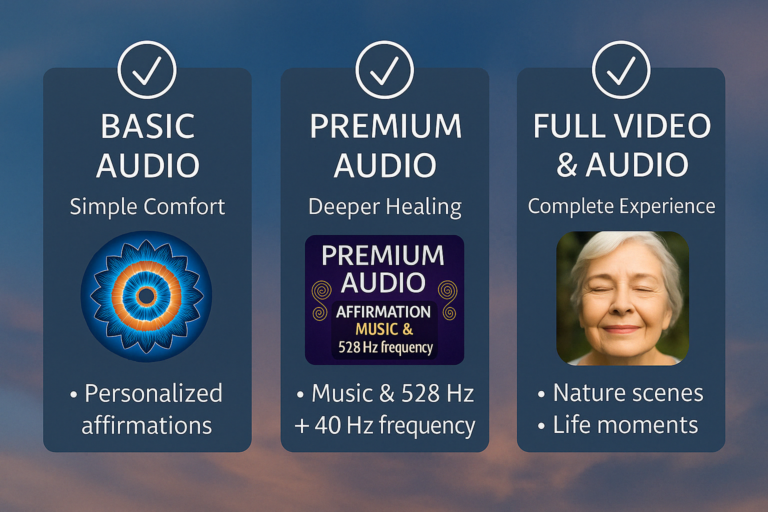 A soothing, personalized affirmation designed to comfort your loved one with dementia—available in calming audio or video format. Featuring their name, healing sound frequencies, and layered “YOU ARE” + subliminal “I AM” affirmations to ease anxiety and support memory care. Also provides caregivers with a moment of peace during daily routines.